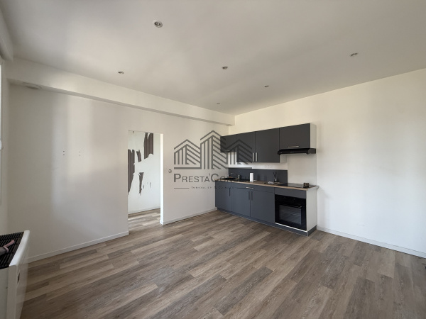 Équipements : Cuisine aménagée avec plaques de cuisson et meubles hauts/bas déjà installés.
